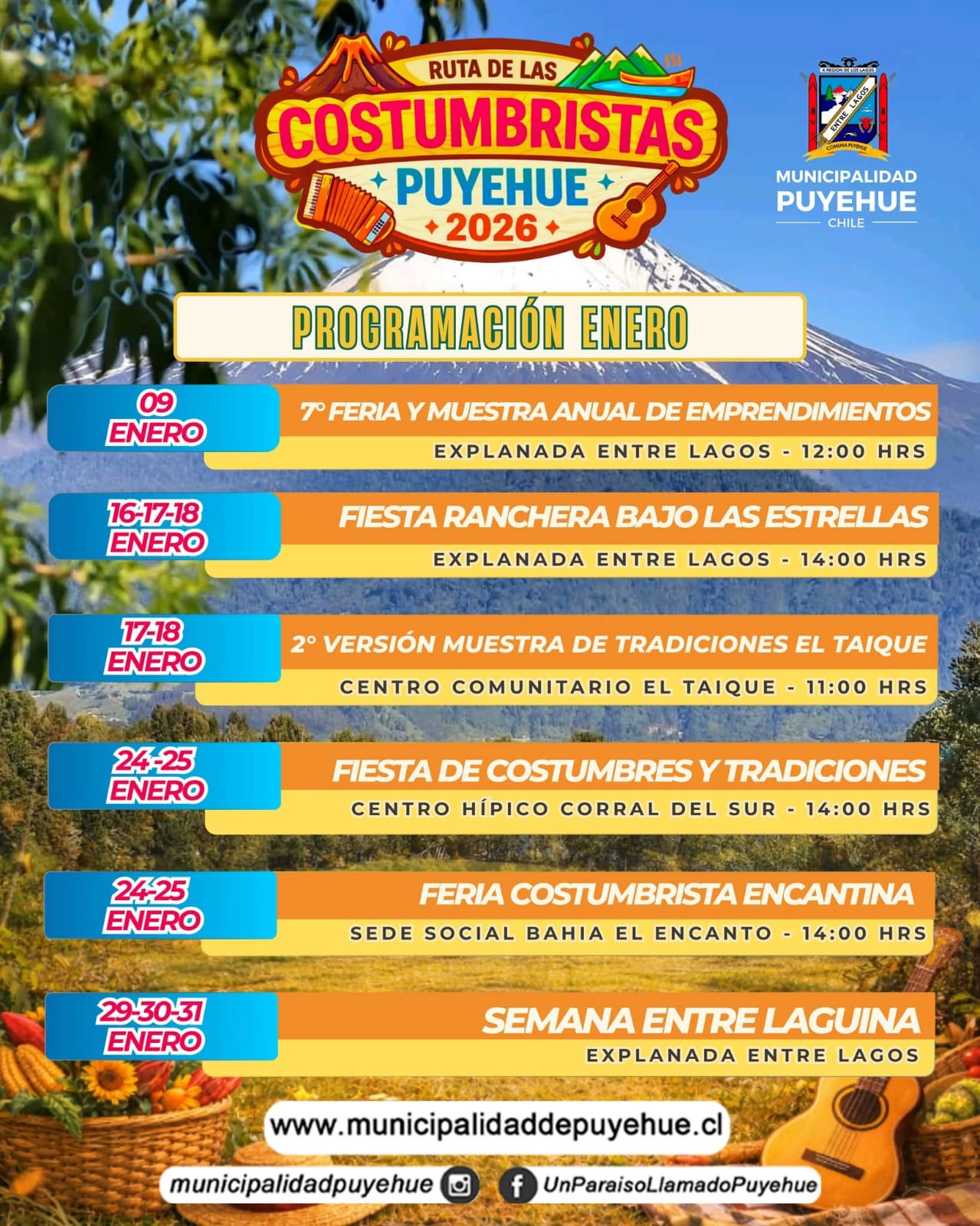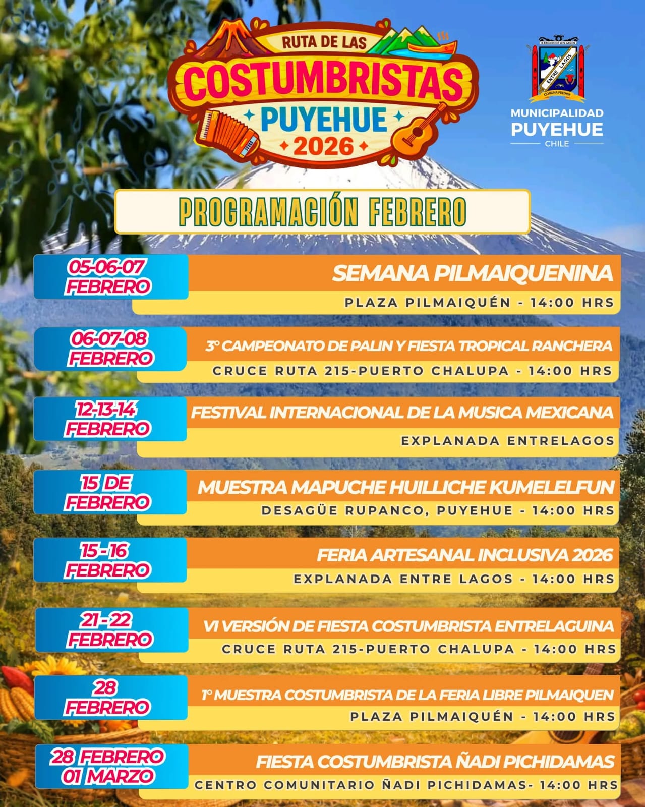 Finalmente, desde el municipio se destacó que, además de estos grandes eventos, durante todo el verano se desarrollarán fiestas costumbristas cada fin de semana en distintos sectores de la comuna de Puyehue, con el objetivo de potenciar la identidad local, el turismo y el desarrollo cultural de las comunidades rurales.