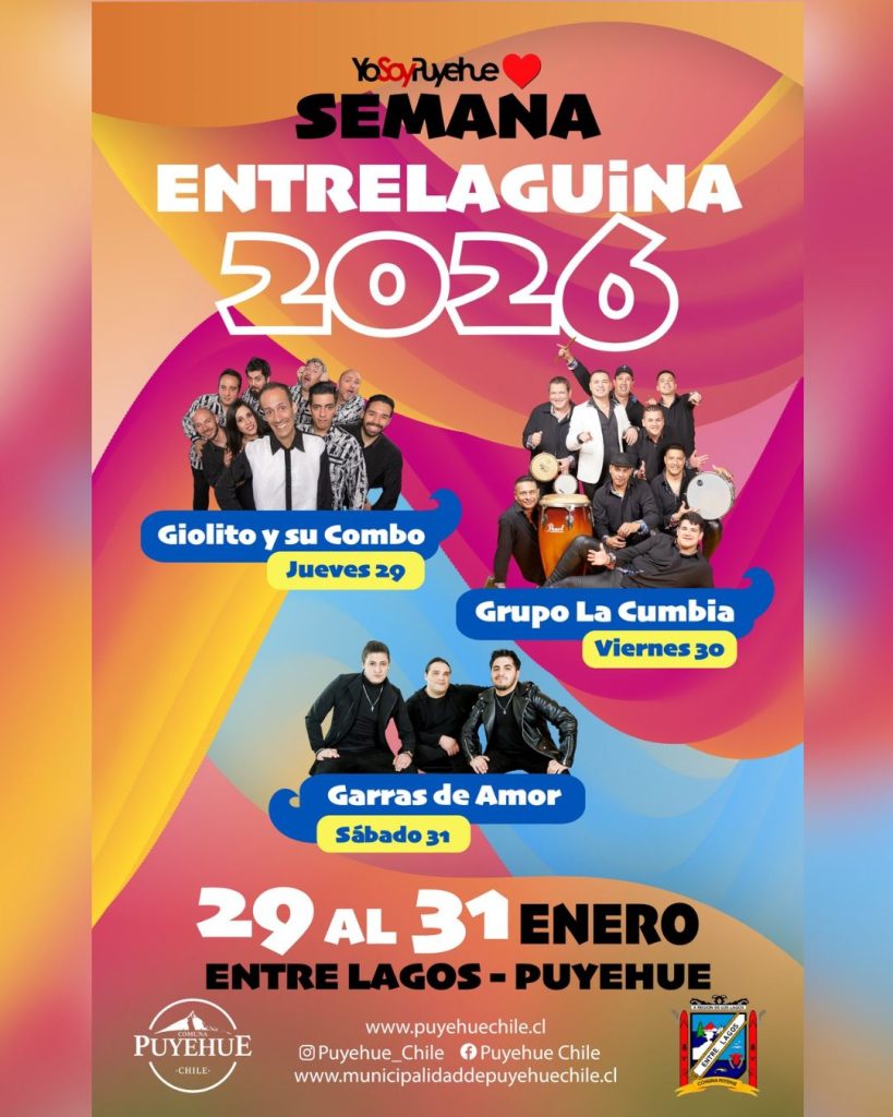 Uno de los principales hitos del verano será la Semana Entrelaguina 2026, que se llevará a cabo los días 29, 30 y 31 de enero en la explanada de Entre Lagos, evento que contará con reconocidos artistas nacionales e internacionales. La jornada inaugural, el jueves 29 de enero, tendrá como show principal a Giolito y su Combo; el viernes 30 de enero se presentará Grupo La Cumbia, mientras que el cierre, el sábado 31 de enero, estará a cargo de Garras de Amor.