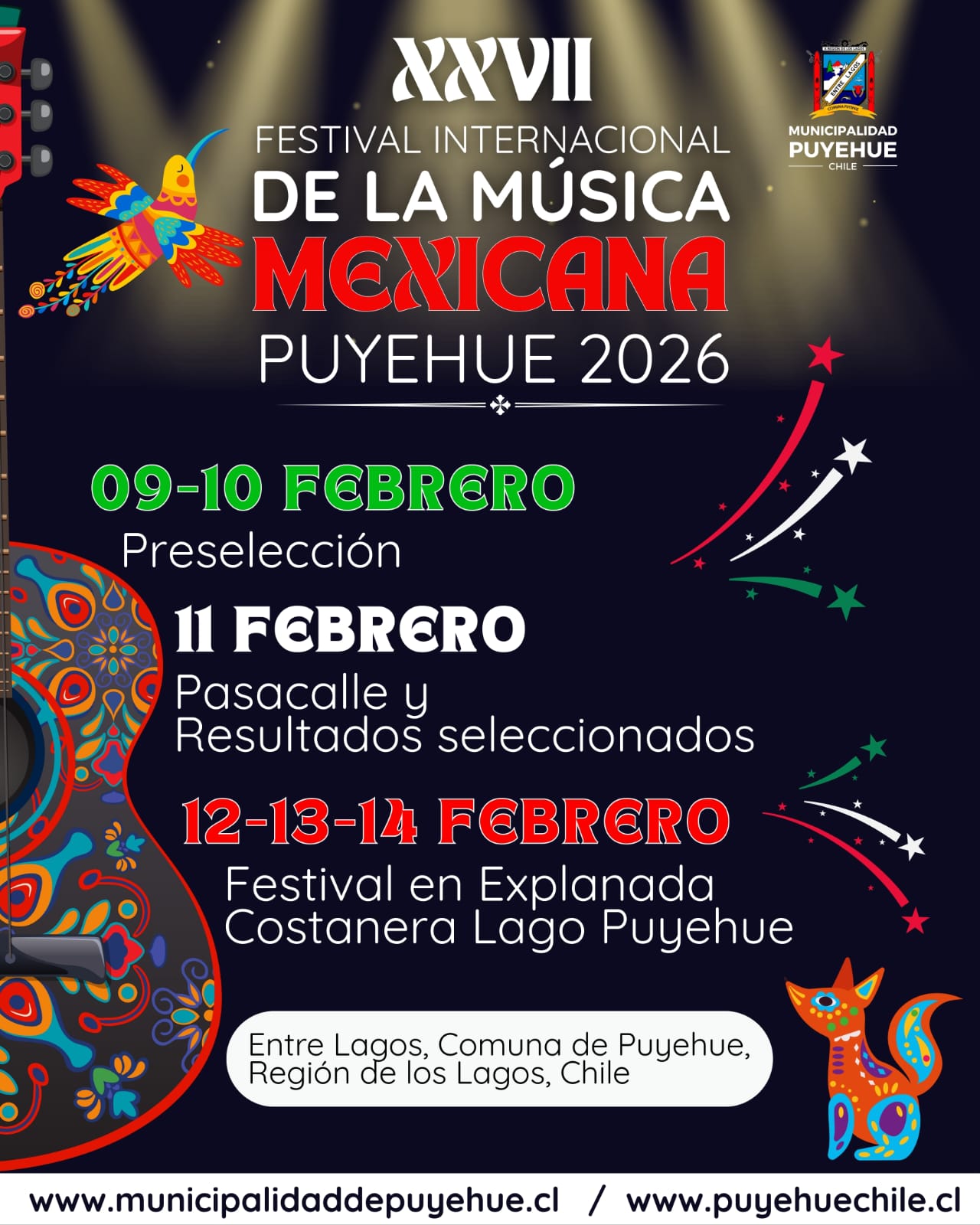 Junto a ello, se anunció la realización de la XXVII versión del Festival Internacional de la Música Mexicana, uno de los eventos más emblemáticos de la comuna. La etapa de preselección se desarrollará los días 9 y 10 de febrero, mientras que el 11 de febrero se efectuará la selección de los diez participantes que competirán en el festival, además del tradicional pasacalle por las calles de Entre Lagos.