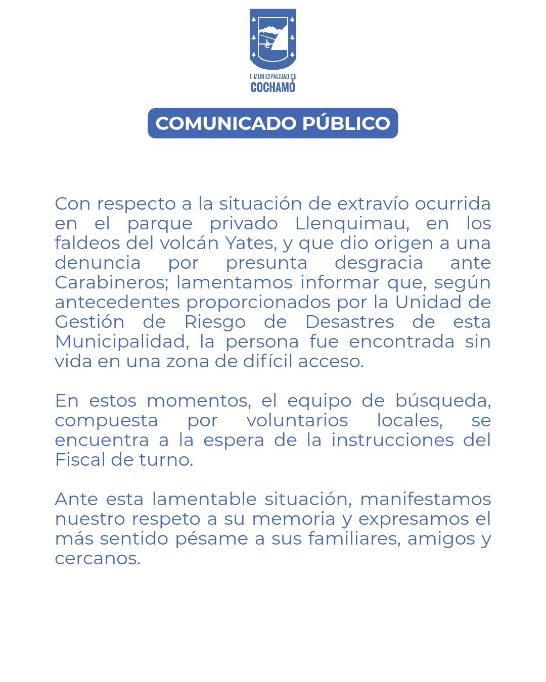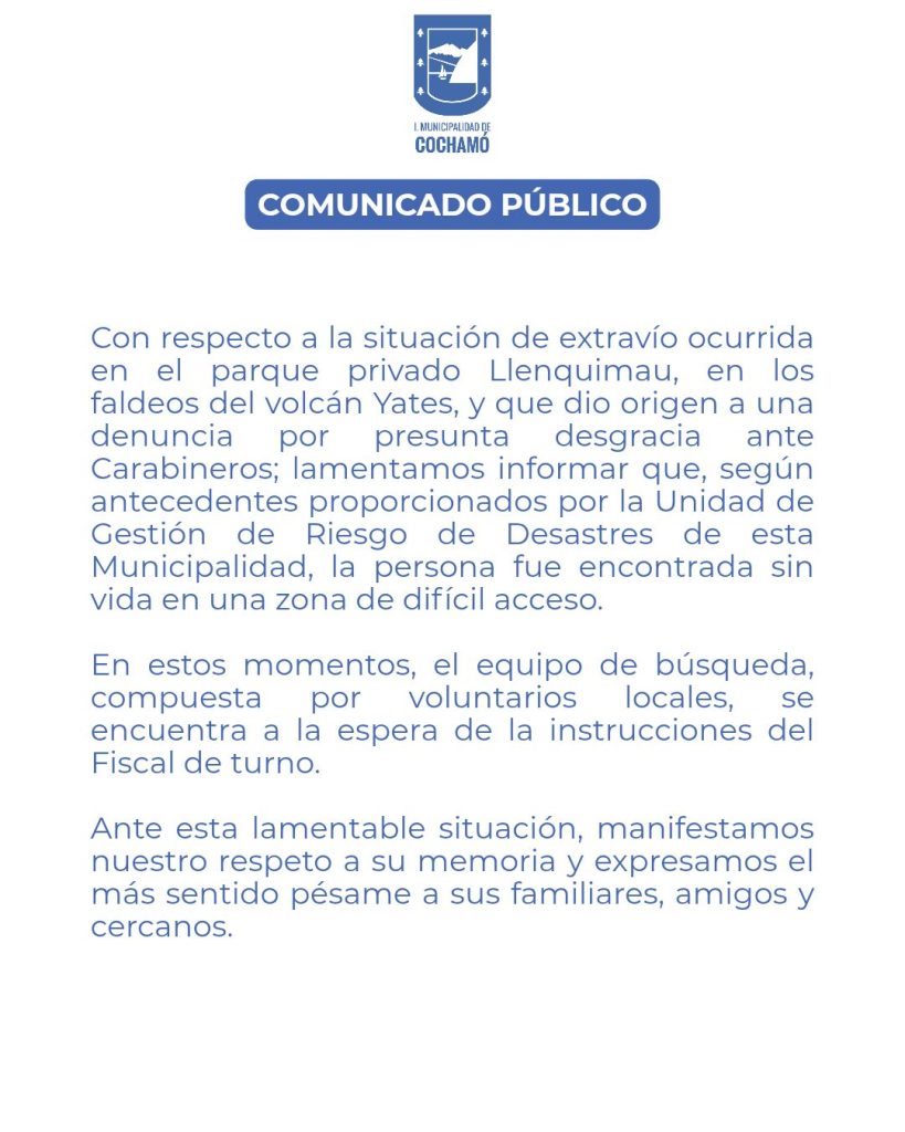 El hallazgo fue realizado por uno de los equipos de búsqueda compuesto por personal del Parque Llanquimau, equipo de rescate particular y Carabineros, que se encontraban desplegados en el sector roquerío del sector Piedra Amarilla, lugar que no cuenta con acceso habilitado por sendero, al interior del parque, ubicado en ruta V-69, kilómetro 84, sector interior en Río Puelo.